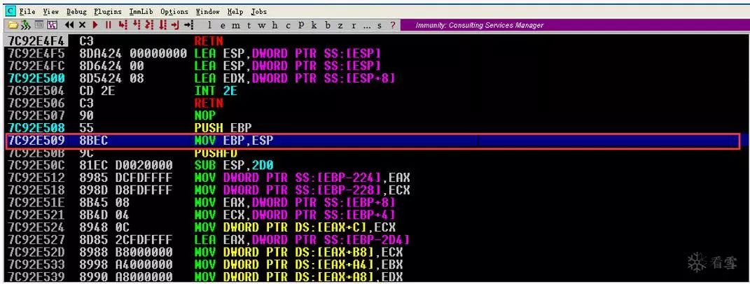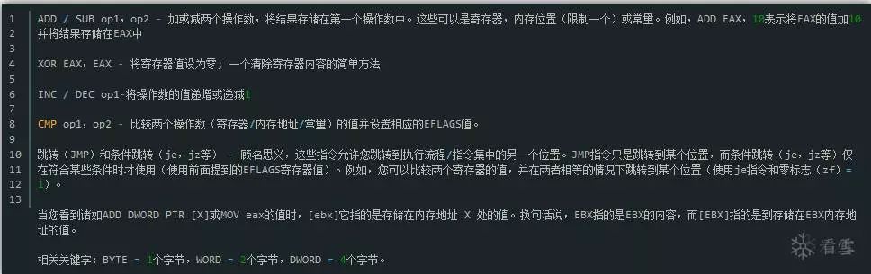这只是一个简单的例子,您可以在Immunity中关注每条CPU指令的执行情况。以下有几个更常见的汇编指令和语法你会遇到: