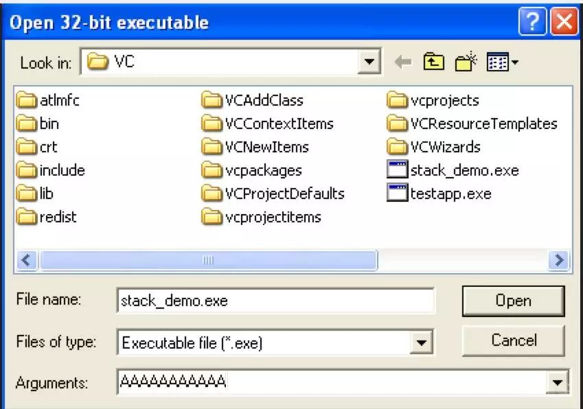 我使用Visual Studio命令提示符(2010)编译了这个c程序(作为stack_demo.exe)。你可以直接从Immunity运行一个带有命令行参数的程序,方法是选择File-> Open(或者简单地按F3),选择你的可执行文件,然后在给定的字段中输入你的命令行参数。