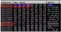 如果您想要证明地址00332FD4包含0033301C(这是指向argv [1]的指针),请参阅该地址的转储内容:
