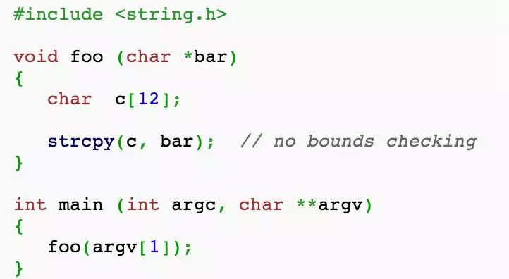 这段代码简单地调用函数foo(),并传递给它一个命令行参数作为参数(argv [1])。函数foo()先声明一个长度为12的变量c。然后它调用函数strcpy(),它将argv [1]的值复制到变量c中。正如注释所述,没有边界检查,所以这种使用strcpy可能会导致缓冲区溢出,我将在本系列的第2部分中演示这些缓冲区溢出。现在,我们只关注这个函数如何影响栈。