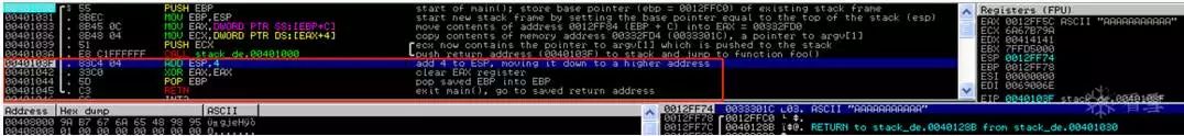 尽管main()除了调用函数foo()之外,还有一些工作必须首先发生,就像在调试器中看到的那样。首先,它将Argv [1](AAAAAAAAAAAAA)的内容推送到栈。然后,当函数foo()被调用时,返回地址被保存到栈中,保证程序执行流程可以在函数foo()终止后恢复。