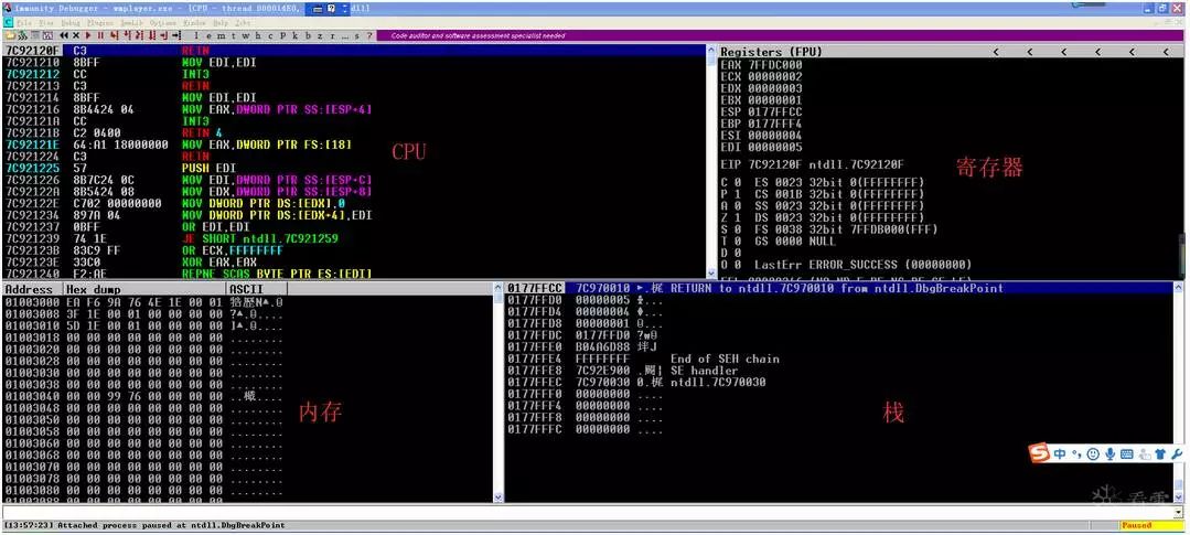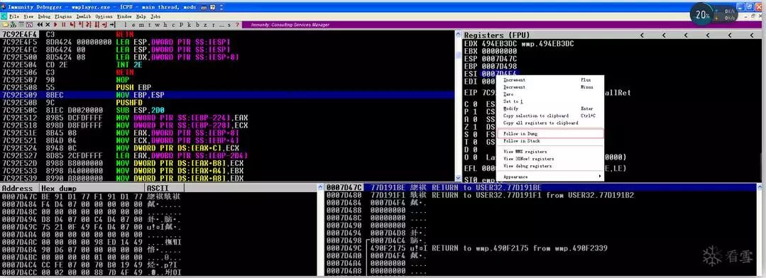 您可以逐个执行程序的执行流程(F7)并查看每条CPU指令的结果。我们来看看当前Windows Media Player的一条简单的汇编指令: