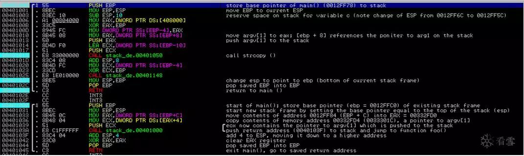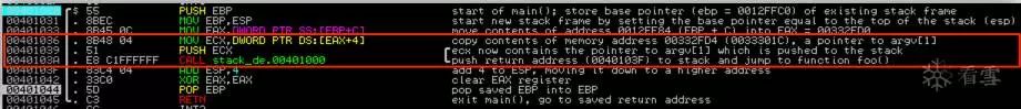 函数main()将通过将栈指针向下移动(通过将其值增加4)并清除argv [1]。然后它将通过XOR存储argv [1](EAX)的寄存器,恢复保存的EBP并返回到保存的返回地址。