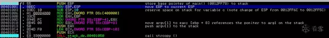 接下来,通过以下指令为局部变量c(char c [12])开辟空间:SUB ESP,10。