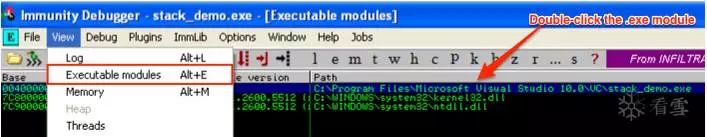 如果你想动态调试,你可能会想要在代码的相关部分插入一些断点。由于地址可能发生变化,查找我们相关程序代码的最佳方法是选择查看 - >可执行模块(或Alt + E)。然后,双击stack_demo.exe模块(或任何您命名为.exe的文件)。