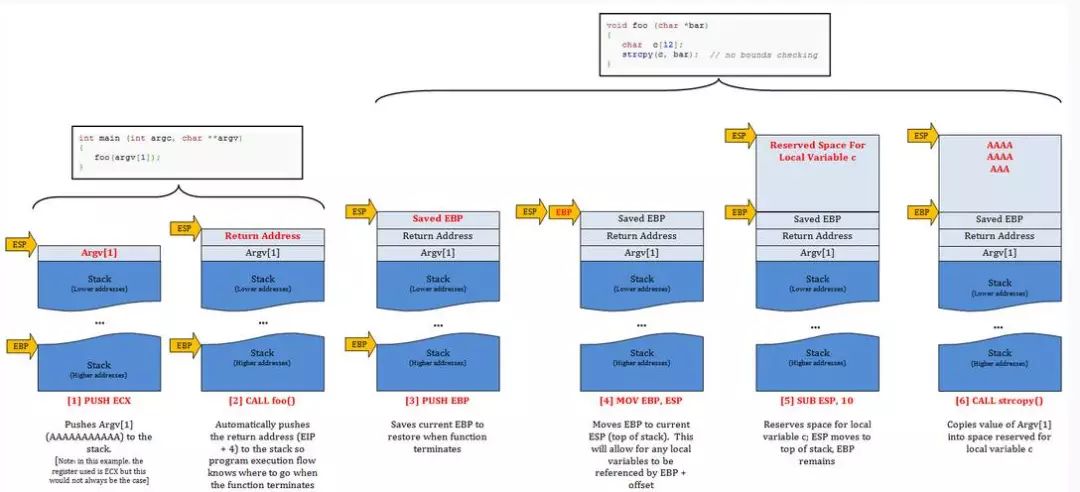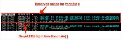 一旦函数foo()被调用,首先发生的事情是当前基指针(EBP)通过PUSH EBP指令保存到堆栈,这样一旦函数终止,main()堆栈的基础就可以恢复。