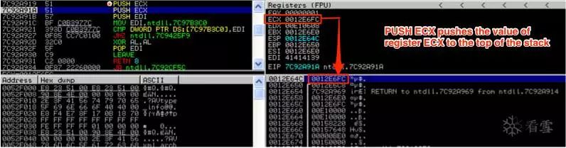 我们从第一个PUSH指令开始(PUSH ECX)。