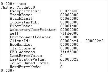 就像每个程序/进程都有一个PEB一样,每个线程都有一个线程环境块(TEB)。TEB存储image loader和各种Windows DLL的上下文信息,以及异常处理程序列表的位置(我们将在后面的文章中详细介绍)。和PEB一样,TEB驻留在进程地址空间中,因为用户模式组件需要可写访问。