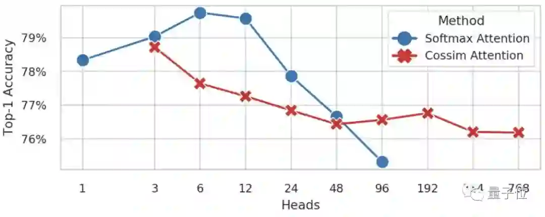 作者在ImageNet-1k上训练了具有不同头数的DeiT-B模型,包括使用标准自注意力(蓝线,基于softmax)和使用多头线性注意(红线,基于余弦相似性)的。