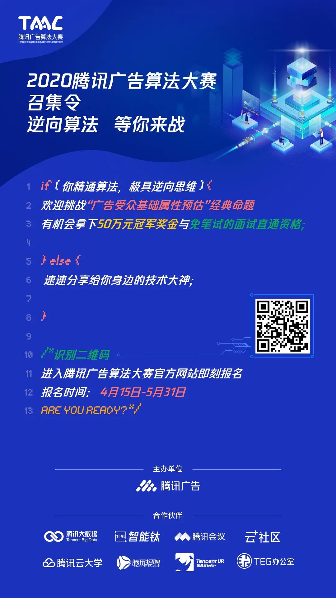 2020 腾讯广告算法大赛再度起航,即日起至 5 月 31 日,赛事正式面向全社会启动线上招募,一场算法之间的「巅峰对决」即将上演!