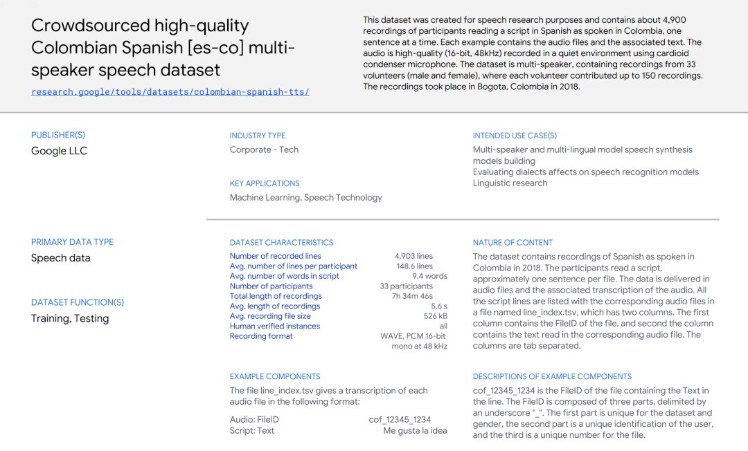 在适当情况下,TFDV 生成的分析可用于为数据集创建数据卡 (Data Cards)。数据卡可视为数据集的 透明度报告,能够提供对收集、处理和使用实践的深入分析。例如,我们的一项研究驱动型工程计划专注于针对某些区域创建数据集,这些区域既缺乏构建自然语言处理应用的资源,又具有迅速增长的互联网渗透率。为帮助希望在这些地区研究语音技术的其他研究人员,负责此计划的团队首先为不同的西班牙语国家/地区创建了数据卡,其中包括上方显示的哥伦比亚西班牙语使用者数据集,提供了研究人员在使用其数据集时的预期效果模板。