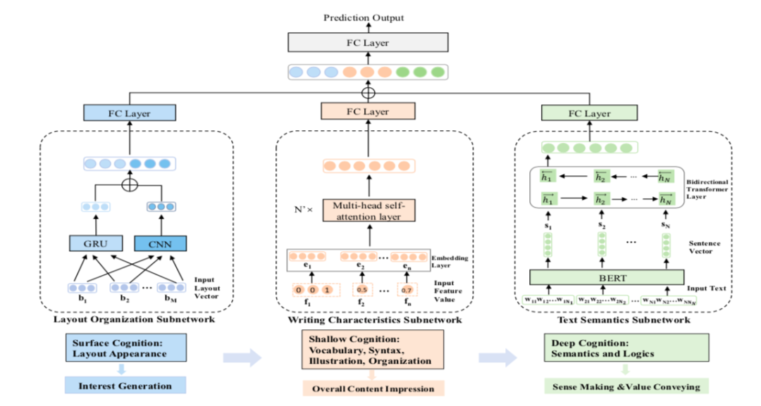 整个模型的设计分为两层,第一层是蓝、粉、绿这三个模块,作为基础的文章质量embedding生成层。第二层是最上方的FC Layer全连接层,这一层主要是做评分。