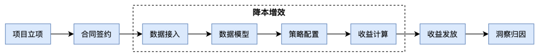从业务层角度而言,一个项目的结算过程可以分为以下几个步骤:立项、签约、数据接入、数据模型、策略配置、收益计算、收益发放、洞察归因等过程。如下图所示: