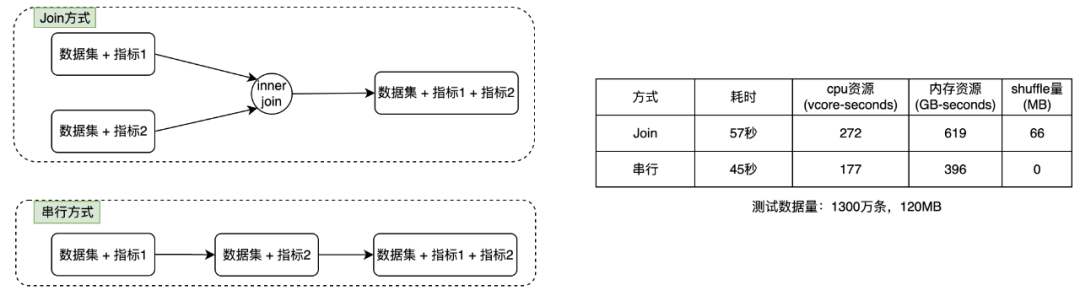 为了证明串行执行的性能更佳,我们也做了简单的实验来进行对比,从耗时、内存消耗、cpu 消耗三个维度进行对比分析,如下图所示,可以看到串行执行的性能全面优于 Join 执行。