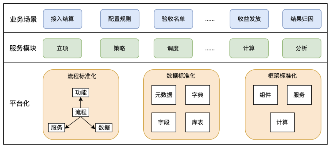 然而只有先做到标准化,平台才能顺利的运转起来,因此在平台化启动前,我们对业务进行了梳理和抽象,从下面三个方面进行标准化建设。