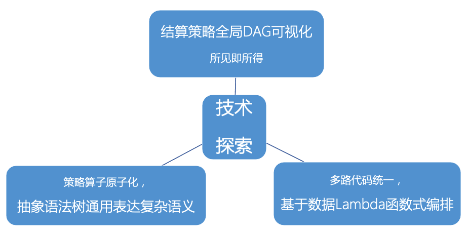 从技术上来说,平台化主要做了以下几个探索:结算策略全局 DAG 可视化,策略算子原子化,多路代码统一,如下图所示: