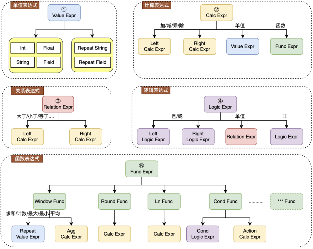插件表达式:插件可以理解成一个表达式计算,我们借鉴了 SQL 引擎的 ExpressionTree 方案。表达式的定义通 pb 协议描述,我们将表达式分为 5 种基础类:①单值表达式、②计算表达式、③逻辑表达式、④关系表达式、⑤函数表达式,其中函数又可以细分成多种,表达式之间可以进行嵌套、组合,从而其描述能力是可扩展的。之所以抽象成 5 种类型,主要是参考了 SQL 的语法元素,并考虑结算业务的需要,目标是能覆盖所有的策略场景,并以结构化的形式表现出来。