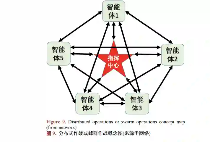 分布式作战包括空中分布式作战、陆路分布式作战、海上分布式杀伤、水下分布式作战、空间分布 式结构等,蜂群作战是一种仿照生物作战的结构体系,如图 9 所示。图 9 作为一个分布式作战体系结构,由一个指挥中心控制多个智能体,这里用智能体 1、2、3、4、 5 表示。每一个或多个智能体与指挥中心之间、多个智能体之间相互关联,协同作战,包括自主攻击、 智能规避威胁、信息数据高速传输与共享等,形成一个乱中有序的蜂群作战模式。作战状态下,智能武器装备之间不仅可以协调配合,还可以协同配合,通过自主协同、群体智能技 术提高作战能力,具有灵活性强,对抗性强的特点。目前,分布式作战或蜂群作战应该在以下方面还需 取得进一步研究。一是战场信息化网络技术。由单一智能体转为多智能体,智能体之间需要由协调转为协同,在特定 战场中,依赖于智能网络组成的作战体系,要求智能体之间的数据传输极强,实时性极高,能够保证智 能体之间的稳定性、可靠性。二是分布式或蜂群人工智能技术。战时状态下智能体要具有智能定位与识别目标、智能决策、智能控 制、智能协同、智能认知、自组织等作战能力,这就需要在分布式或蜂群人工智能技术方面取得新突破。三是分布式或蜂群协同作战技术。分布式或蜂群作战,每一个子成员都是一个智能体,既能够单独 完成任务,也可以协同自身以外的子成员完成任务,单个或多个智能体之间都具有自主控制、自主决策、 自主认知的能力,这就需要在协同作战技术上取得新突破。四是分布式或蜂群编队控制技术。作战环境中,只有一定的战术策略才能够赢得战场的主动权。分 布式或蜂群之间要具有极高效的控制能力,包括自主控制、障碍回避,自主威胁识别能力,需要在编队 控制技术上取得新进展。