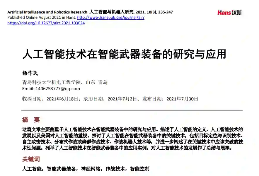 类似的,利用人工智能技术在军事中的应用实例还包括在信息化武器装备中的应用[33]、在导弹领域 的应用[34]、导弹控制技术[35]、美军智能武器装备的发展等[36],虽然这些人工智能技术有些已经付诸 实践之中,有些还在研究中,但是总体还不够成熟,需要进一步的研究与技术突破。