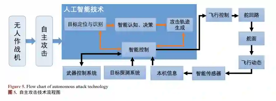 自主攻击技术无需远程人员操控,只是依赖于智能武器装备本身所携带的传感器、计算机、智能芯 片等先进部件,对敌方的信息自动搜索、识别、智能决策、选择与自主攻击。最具代表性的是无人作战 机,使得无人作战机不仅具有隐身的功能,还应具有自行完成起飞、自主攻击,返回与降落等功能,其 中,自主攻击是取得胜利的关键因素。图 5 为自主攻击技术流程图。