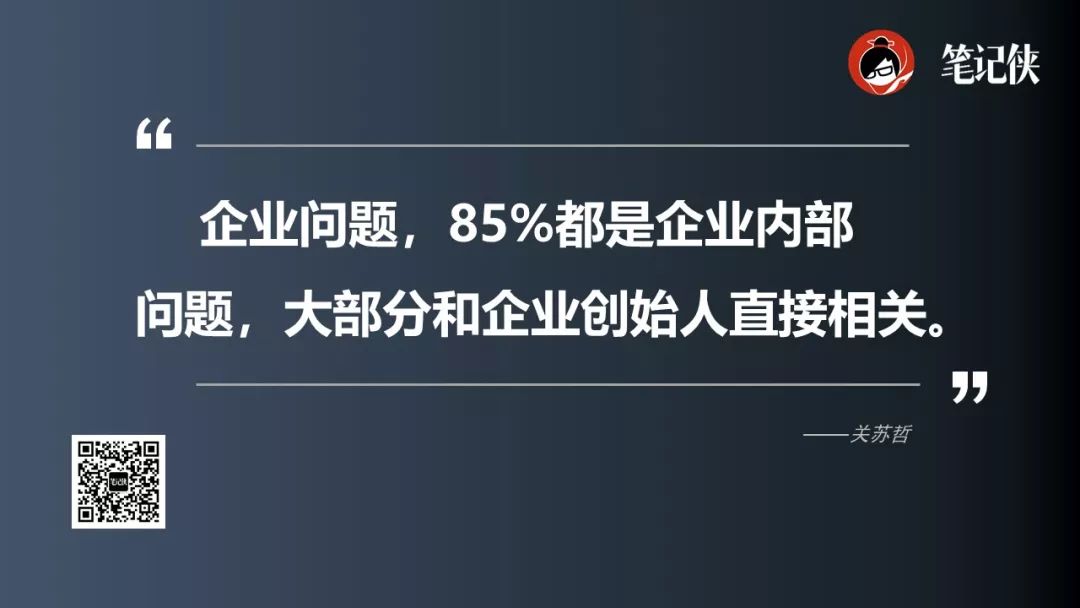 企业的问题,只有15%是外部环境造成的,85%都是企业内部问题,而企业内部这些问题大部分和企业创始人直接相关。