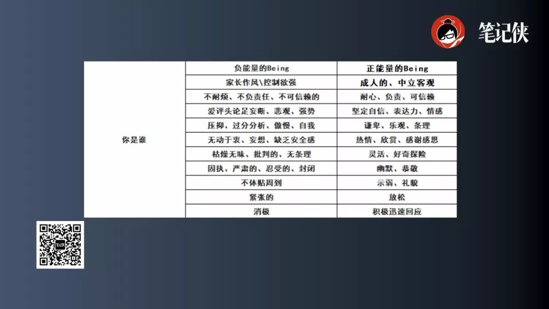 Being,是内在的心智模式和能量状态,是灵性、灵魂、生命能量、精髓、核心、存在,外在的being是展现出来的性格,而内在的being 是心智模式,如信念 ( Belief)、价值观( value )、规则准则(rule)。