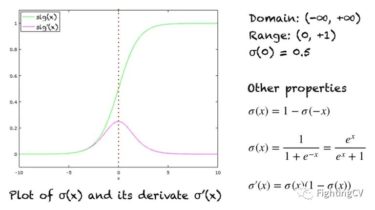 Sigmoid 函数是一条 s 形曲线,如下图中的绿线所示。该图还显示了粉红色的导数图形: