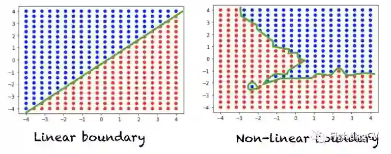 假设我们有一个典型的分类问题,我们在空间中有一组点,每个点被分配一个类标签。如果一条直线(或 n 维空间中的一个超平面)可以将这两类分开,那么我们就有一个线性可分问题。另一方面,如果一条直线不足以划分这两类,那么我们就有一个非线性可分问题。下图显示了二维空间中的数据。每个点被分配一个红色或蓝色的类标签。左图显示了一个线性可分问题,该问题需要一个线性边界来区分两类问题。右图显示了一个非线性可分问题,需要一个非线性决策边界。