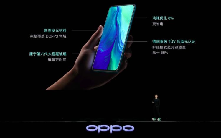 Reno采用的是一块来自三星的OLED屏幕,其采用了新型的发光材料,覆盖DCI-P3色域,最大亮度500nit。另外,其采用了康宁第六代大猩猩玻璃,能经受15次从1米的高度到粗糙表面的跌落,比第五代大猩猩玻璃的表现翻倍。这块屏幕还支持低亮无频闪模式。OPPO提到,Reno采用了全新的光感屏下指纹技术2.0,其解锁成功率比上代优化20%-30%,解锁速度加快28.5%,整体表现是目前业界的最高水平。