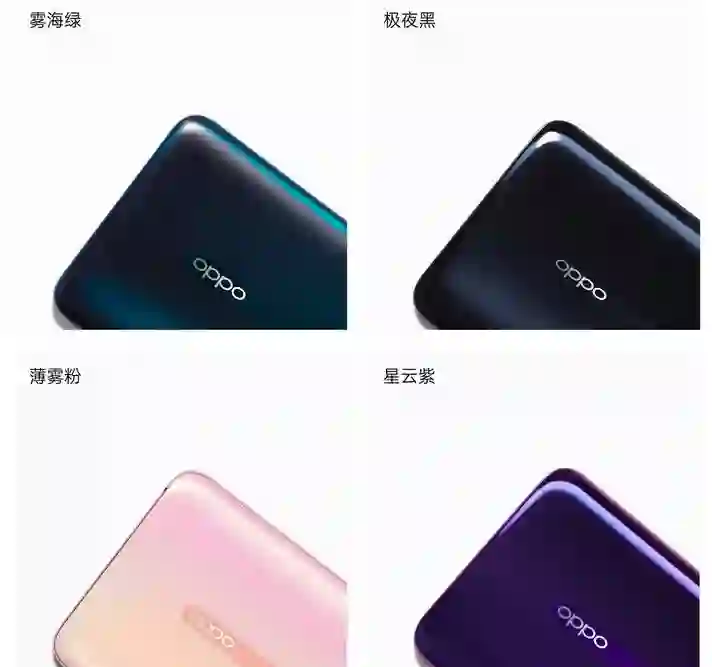 在Reno系列上,Reno拥有四个颜色:雾海绿、薄雾粉、极夜黑和星云紫。其中前两者的背部采用了磨砂玻璃,而后两者则是亮面玻璃。