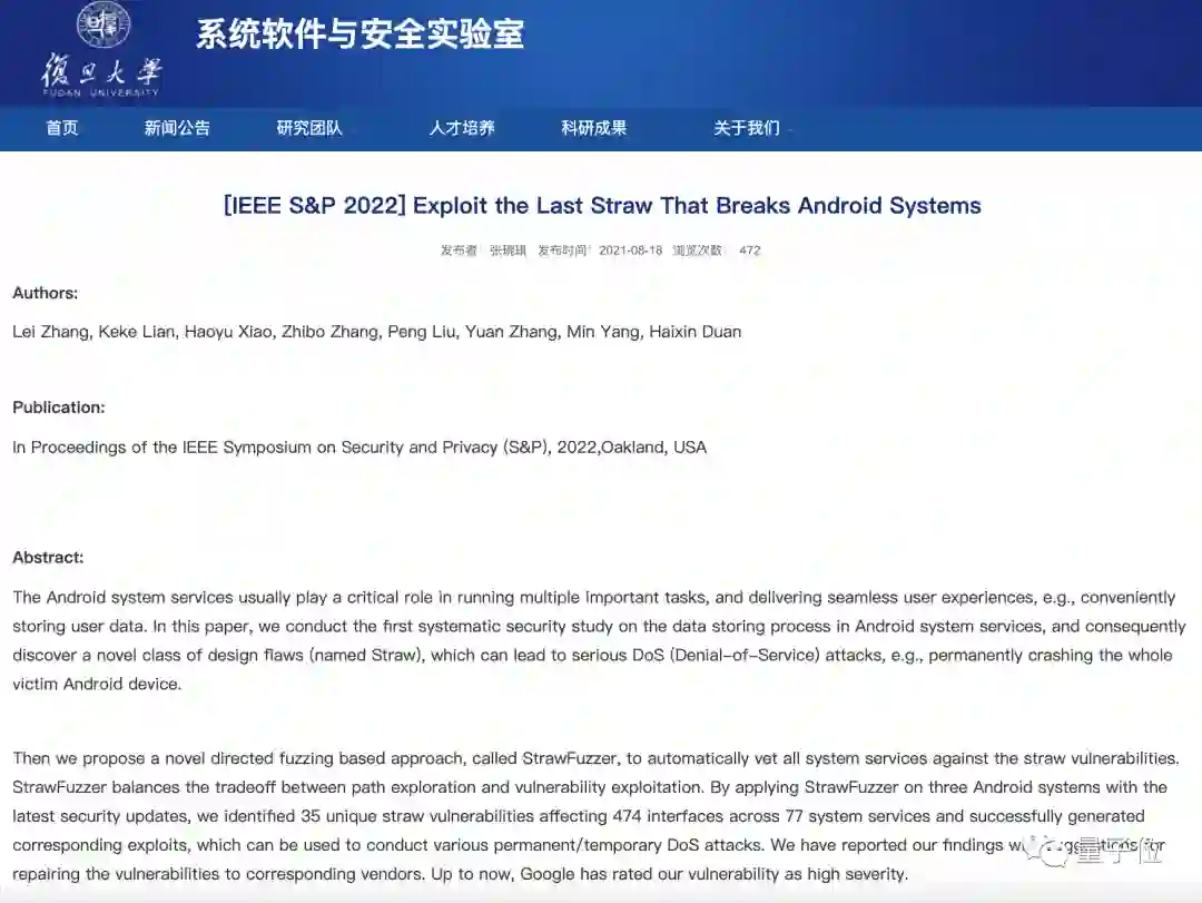 相关的研究成果已整理成论文《Exploit the Last Straw That Breaks Android Systems》,被网络安全顶会IEEE S&P 2022收录: