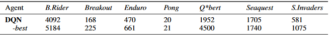 需要注意的是,这又是一次不公平的对比,因为DQN不能搜索,而MCTS可以根据地面实况模型(雅达利模拟器)执行搜索。但是这种程度的不公平有时是不重要的,如果你只想得到一个好结果的话。