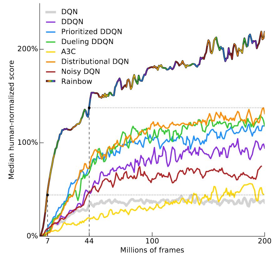 上图的y轴是人类玩家表现的中间得分,研究人员观察了DQN在57场比赛的中的表现,计算了智能体得分情况,之后把人类表现作为衡量指标,绘制出智能体性能曲线。可以看到,RainbowDQN曲线的纵轴在1800万帧时突破100%,也就是超越人类。这相当于83个小时的游戏时间,其中包括训练用时和真实游戏用时,但在大多数时候,人类玩家上手雅达利游戏可能只需要短短几分钟。