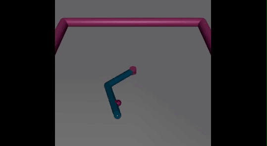 在这个任务中,最初的随机权重会倾向于输出高度正面或者高度负面的动作输出,也就是大部分动作会输出最大或最小的加速度。这就出现一个问题,就是这个连杆机械臂一不小心就会高速旋转,只要在每个关节输入最大力,它就会转得完全停不下来。在这种情况下,一旦机器人开始训练,这种没有多大意义的状态会使它偏离当前策略——为了避免这种情况的发生,你必须实现做一些探索来阻止不停旋转。虽然理论上这是可行的,但是动图中的机器人没能做到。