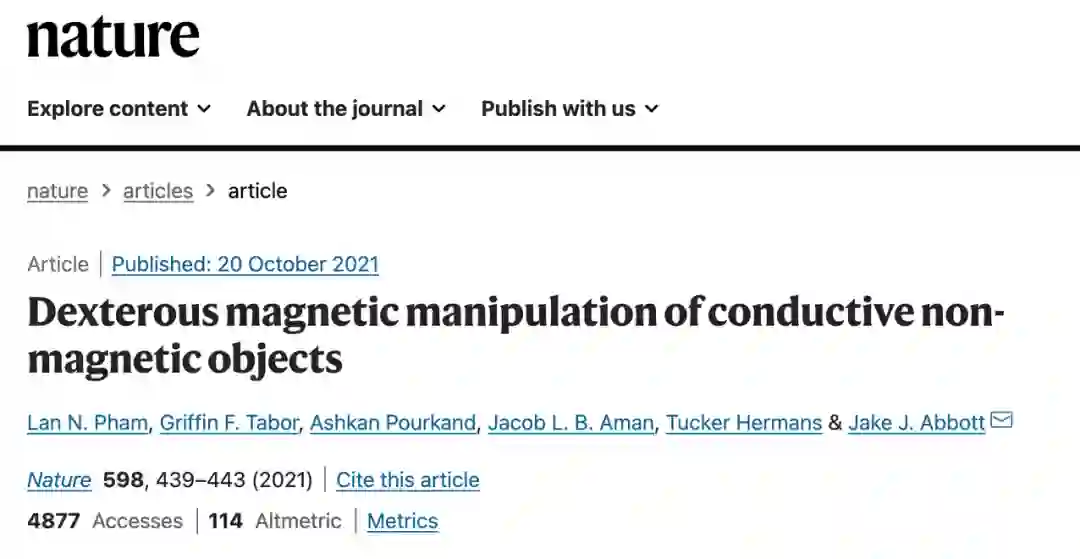 相关研究论文以“Dexterous magnetic manipulation of conductive non-magnetic objects”为题,已发表在权威期刊 Nature 上。