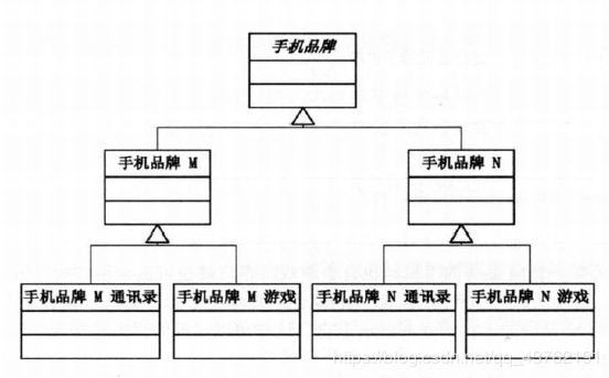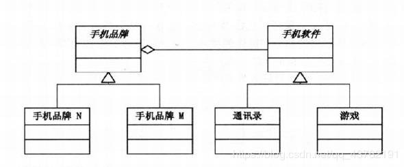 手机品牌和软件是两个概念,不同的软件可以在不同的手机上,不同的手机可以有相同的软件,两者都具有很大的变动性。如果我们单独以手机品牌或手机软件为基类来进行继承扩展的话,无疑会使类的数目剧增并且耦合性很高。