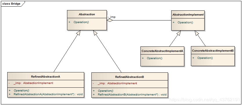 AbstractionImplement::Operation():实现抽象类Abstaction所定义操作的接口,由其具体派生类ConcreteImplemenA、ConcreteImplemenA或者其他派生类实现。