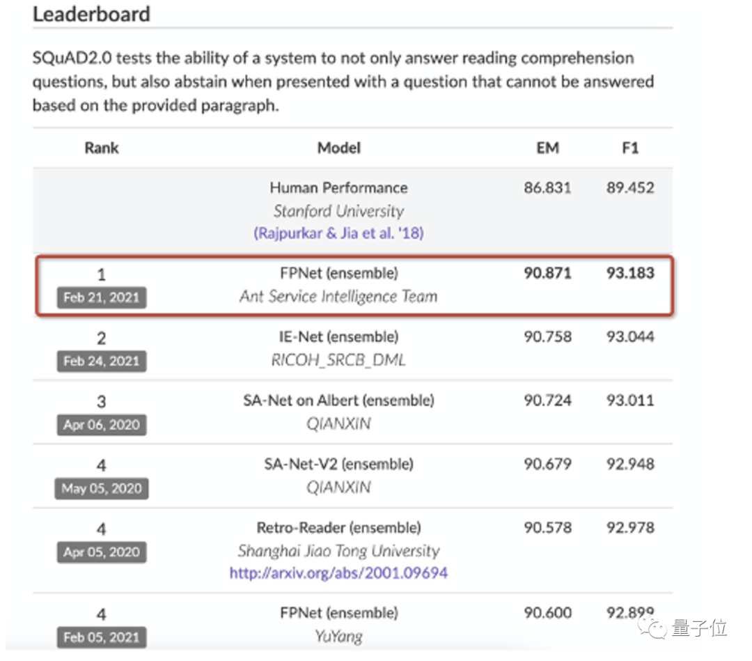 先简单介绍一下,SQuAD 2.0是由斯坦福大学发起的机器阅读理解挑战赛,可以说是全球检验AI阅读理解能力最好,也是代表最高水平的“竞技场”。