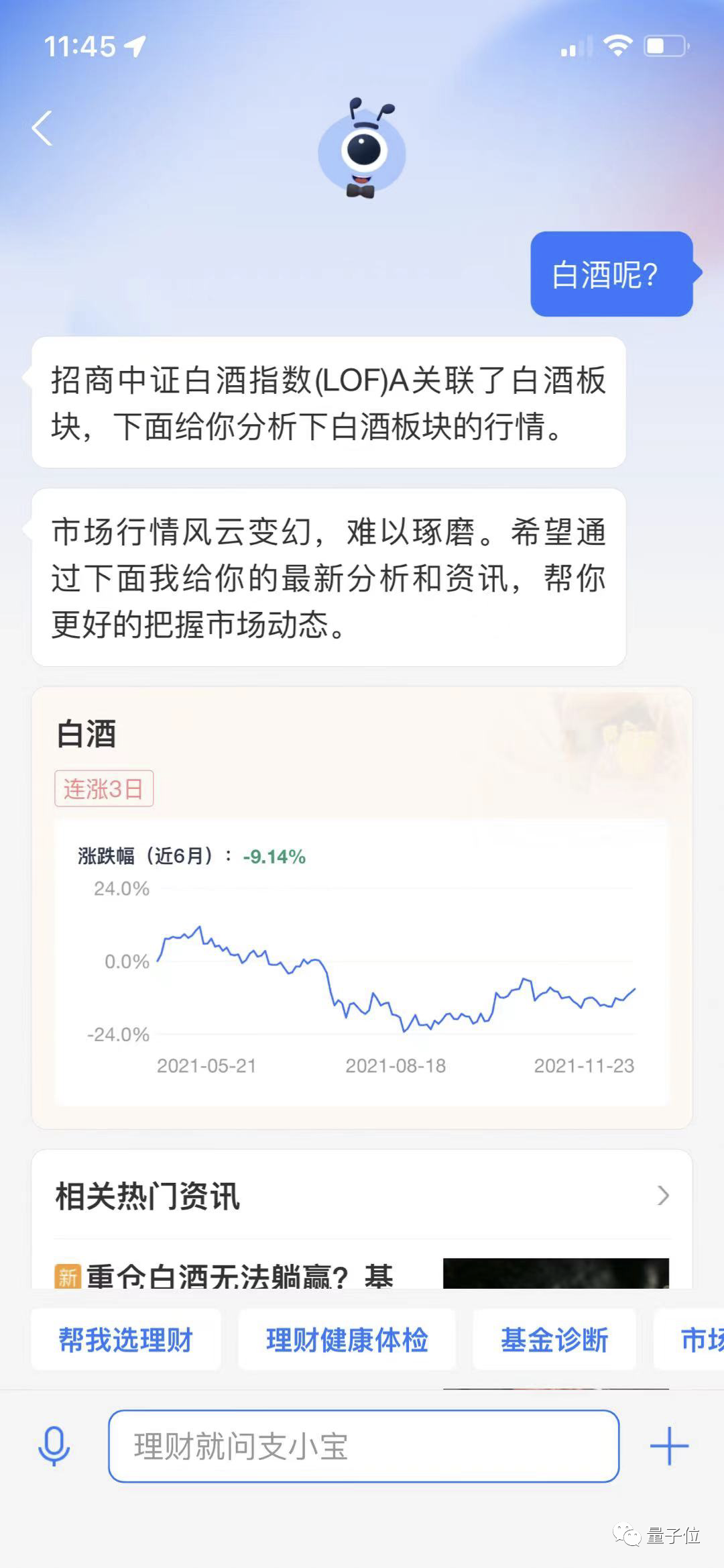 回到前面的测试,我在问完“科技基金如何”后,随手抛出“白酒呢?”,相信大家都有类似的体验,一般的机器人可能会立马弹出几个选项:你是问白酒板块行情如何吗?白酒基金有哪些可以买……然后让我再勾选一轮,再给答案。