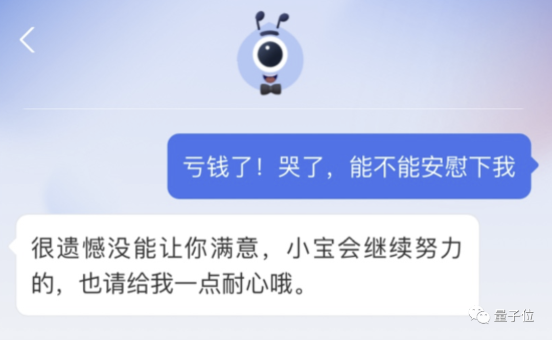 最后我想出了一个比较刁钻的问题——“亏钱了,能不能安慰一下我?”