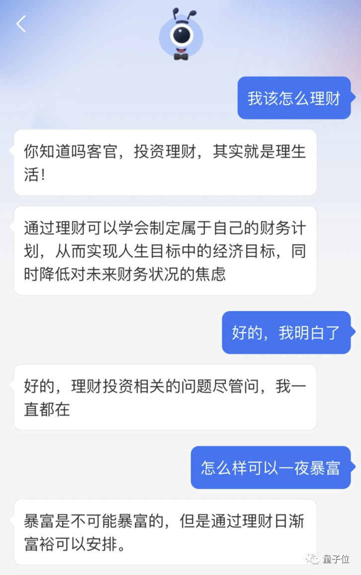 可以看到支小宝在面对这两个问题时,先回答了理财要有目标,并告诫暴富是不可能的,但可以通过理财日渐富裕。