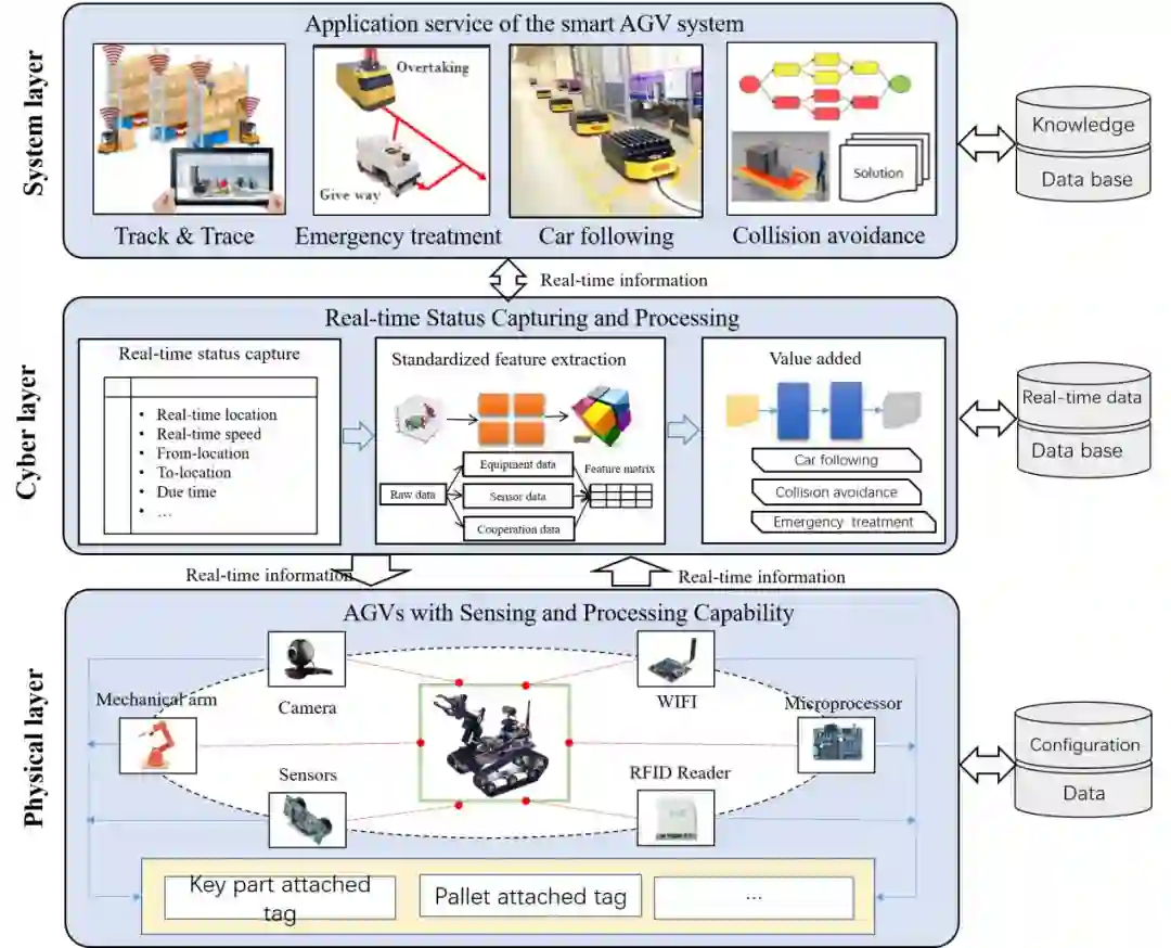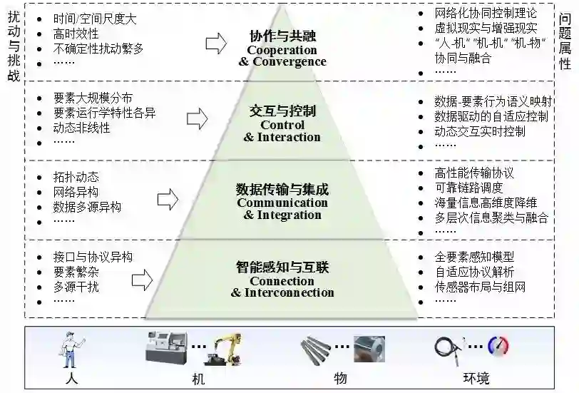 如图2所示,物理是指通过可靠感知物理车间内人、机、物、环境异构全要素信息,实时传输动态网络环境下海量感知数据至信息层,集成规约多源多模态异构数据,并精准控制混杂动态环境下车间异构制造资源的行为协同,从而实现车间内“人-机-物-环境”全要素的智能感知互联、高效数据传输与集成、实时交互与控制、智能协作与共融。