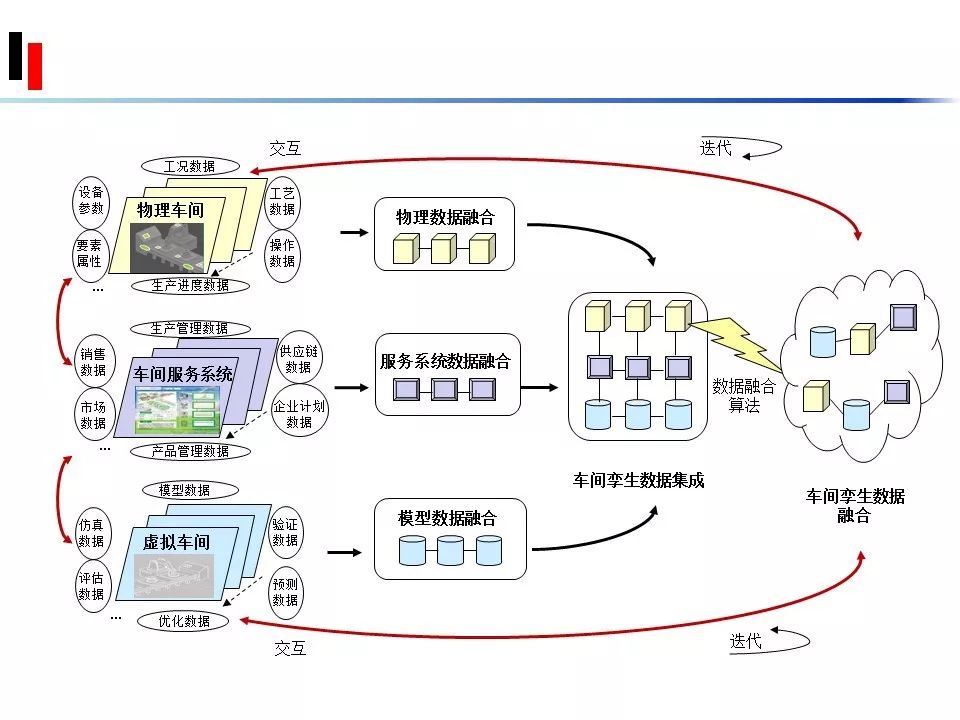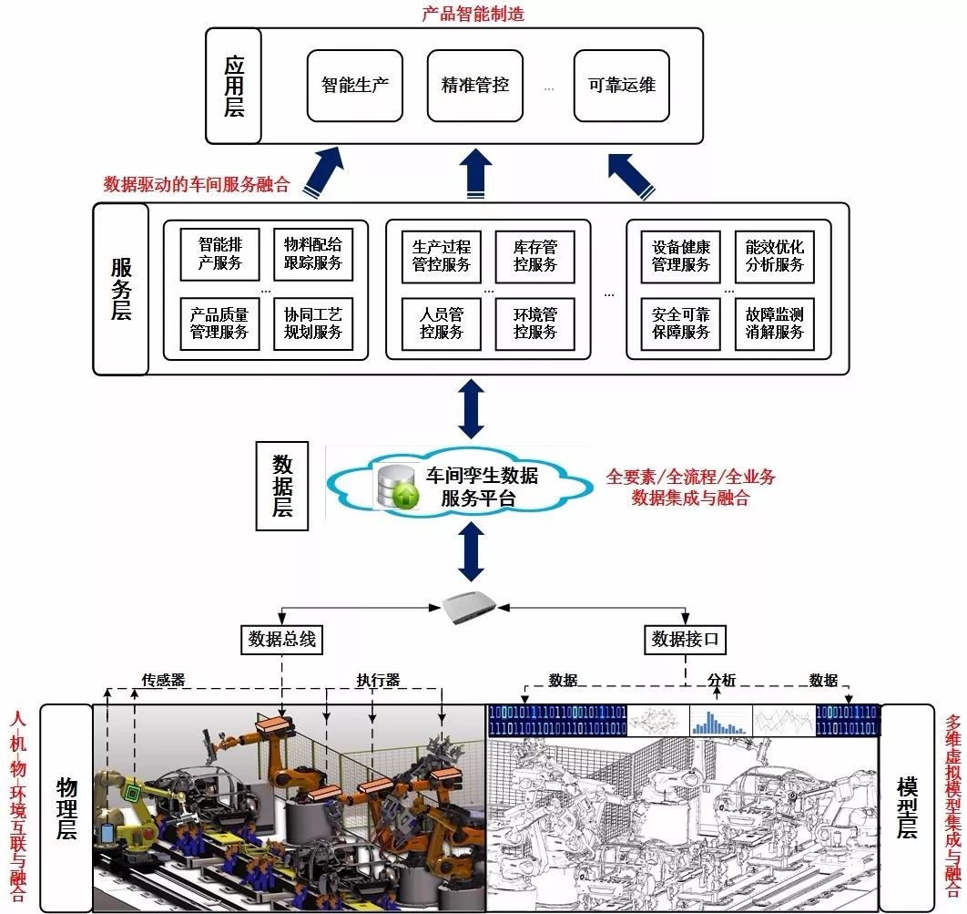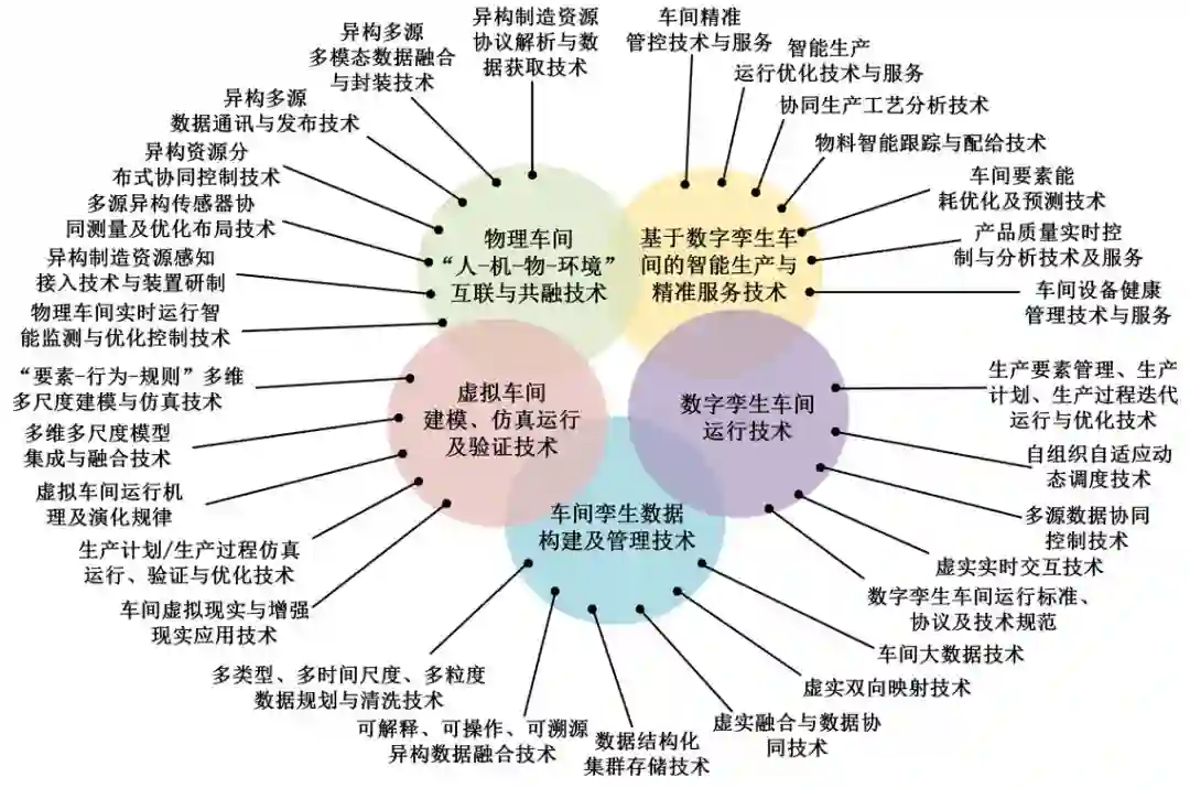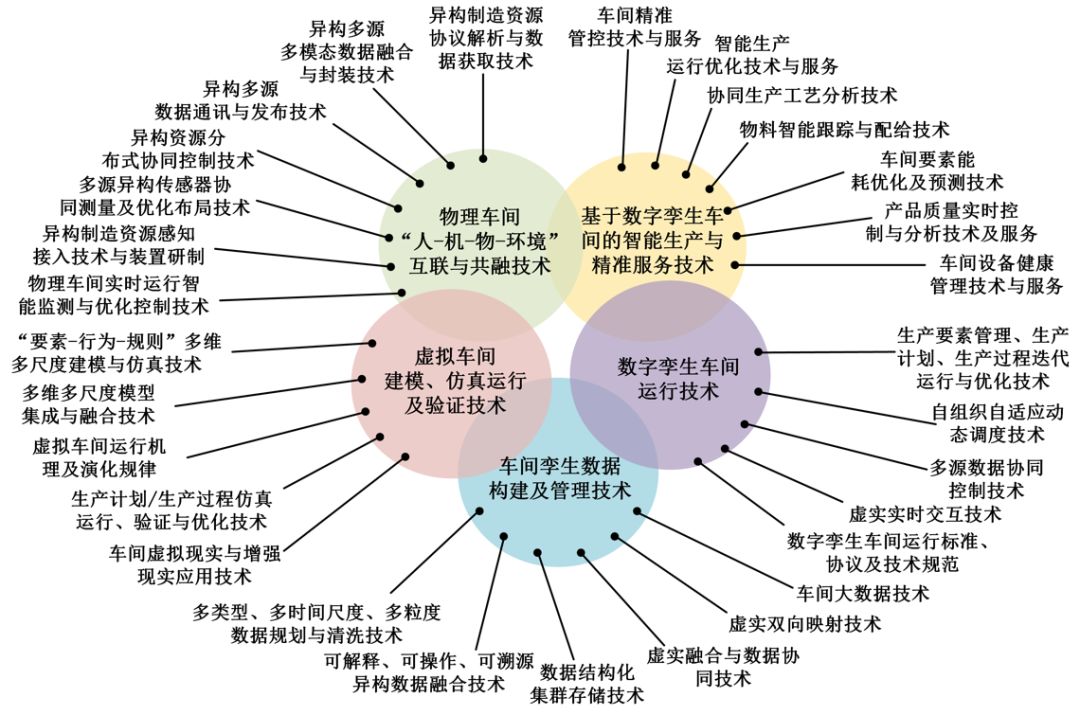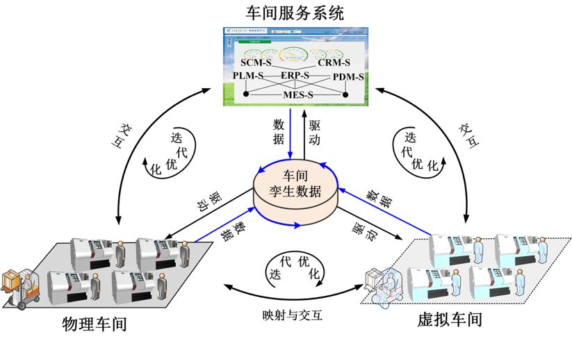 数字孪生车间基于新一代信息技术和制造技术,通过物理车间与虚拟车间的双向真实映射与实时交互,实现车间全要素、全流程、全业务数据的集成和融合,在车间孪生数据的驱动下,实现车间生产要素管理、生产活动计划、生产过程控制等在物理车间、虚拟车间、车间服务系统间的迭代运行,从而在满足特定目标和约束前提下,达到车间生产和管控最优。