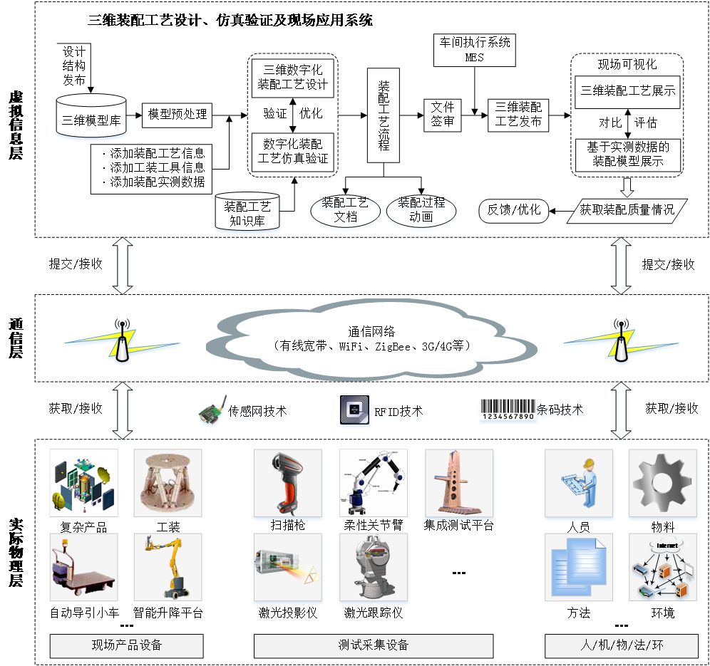目前的虚拟装配技术主要是基于理想几何模型的装配过程分析仿真与验证,面临着如何向实际装配应用层面发展的瓶颈问题。由于虚拟装配技术在装配误差累计、零件制造误差对装配工艺方案的影响等方面缺乏分析和预见性,导致虚拟装配技术存在“仿而不真”的现象,无法彻底解决在面向制造/装配过程中的工程应用难题。上述问题的核心是虚拟装配技术无法支持面向生产现场的装配工艺过程的动态仿真、规划与优化,无法实现虚拟装配信息与物理装配过程之间的深度融合。