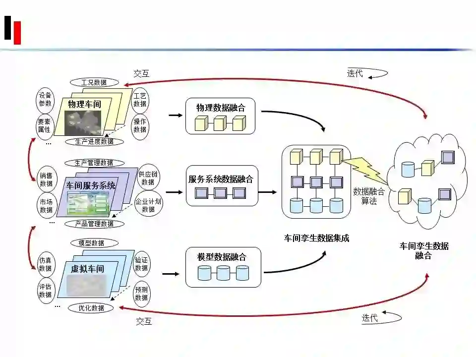 如图4所示,数据融合是指在实现车间物理融合与模型融合基础上,基于车间运行一致性原理,对物理车间现场实时数据、虚拟车间模型数据、仿真数据、车间服务系统数据等覆盖全要素、全流程、全业务的相关数据进行生成—建模—清洗—关联—聚类—挖掘—迭代—演化—融合等操作,有效真实刻画和反映车间运行状态、要素行为等各类动态演化过程、演化规律、统计学特性等。