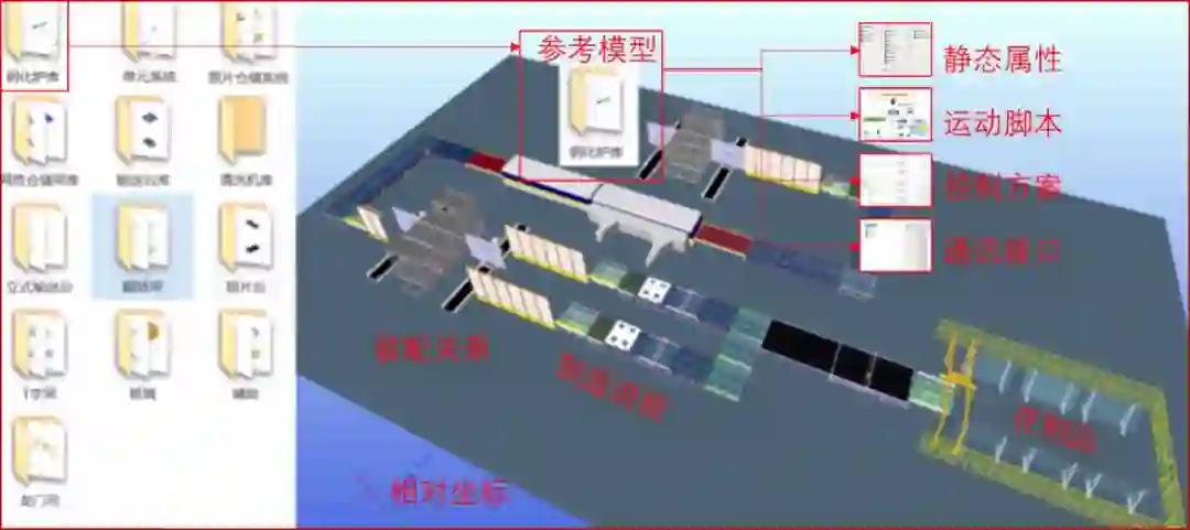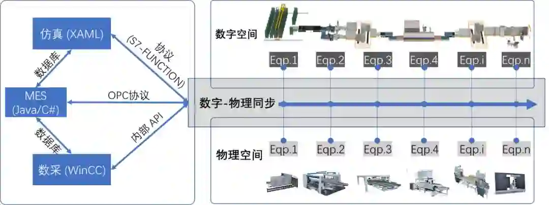 论文提出了一种基于数字孪生的中空玻璃自动化生产线快速定制设计与优化方法(如图1所示)。该方法紧紧围绕客户场地、产能、成本、遗留设备等个性化需求,首先建立了中空玻璃自动化生产线的专用数字化参考模型,支撑客户进行设备快速选型与数字化建模、整线布局设计、设备动作实现与在制品运动规划等;其后,攻克了“模型-装备-监控”多视图同步技术,将数字化的制造系统模型和物理装备进行虚实同步集成,形成整线的数字孪生系统,利用该系统进行多设备异地分布式集成与半实物化的近物理仿真,解决了生产线设计与集成测试成本高、周期长的问题;进而,分析了中空玻璃自动化生产过程中存在的耦合优化问题,提出了一种策略性解耦与计算性解耦相结合的解耦算法,作为引擎驱动自动化生产线及数字孪生系统的运行优化。