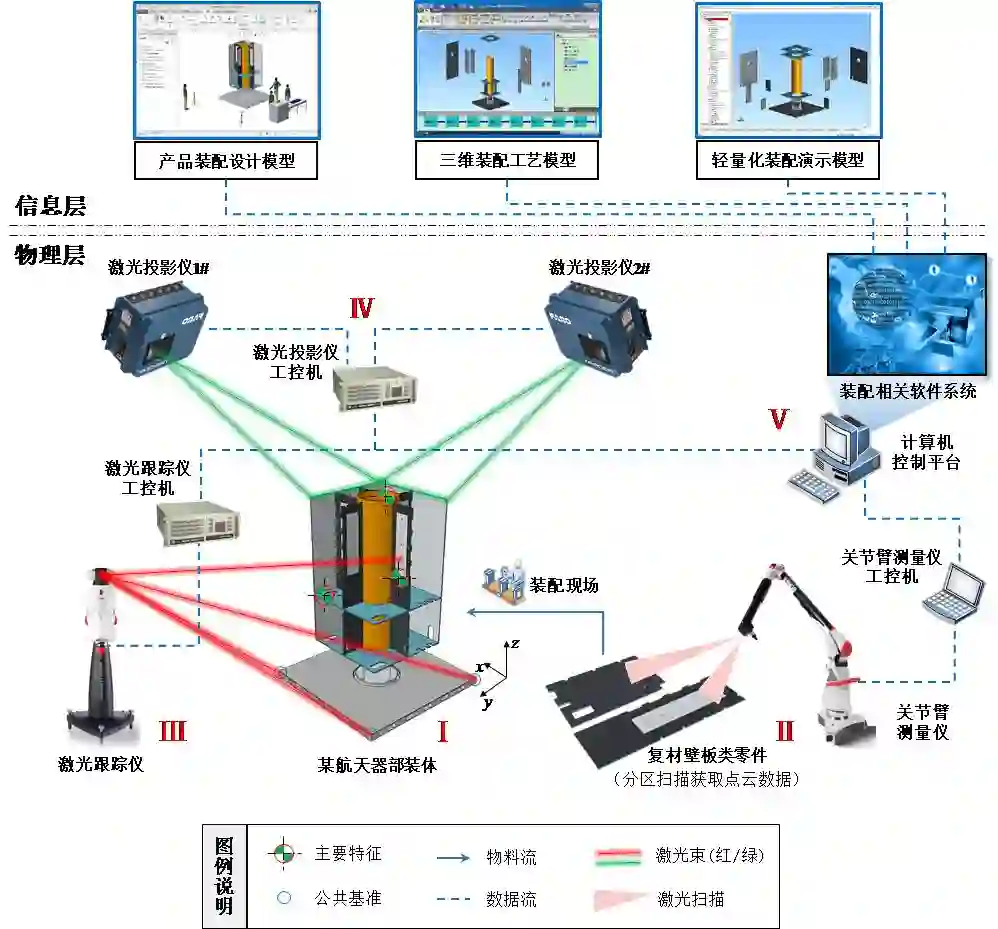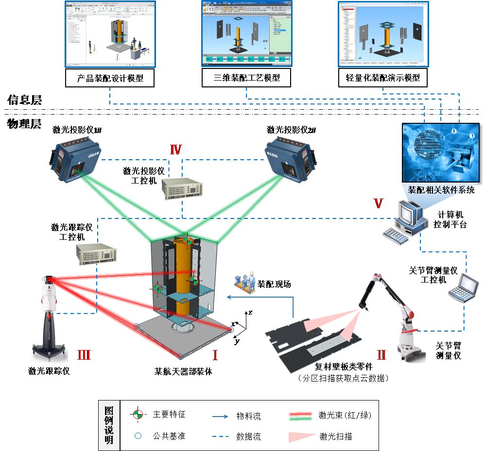 Ⅰ:装配部装体(局部);Ⅱ:关节臂测量仪设备及工控机;Ⅲ:激光跟踪仪设备及工控机;Ⅳ:激光投影仪设备(组)及工控机;Ⅴ:计算机控制平台和相关软件系统。