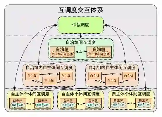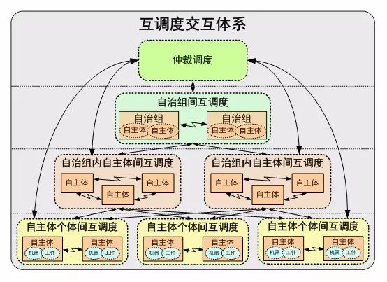 主动调度运作模式下,主动调度决策权呈现出权利重心下移、趋于分散等新的特征。调度运作模式演化为“自主体-自治组-仲裁区”之间“自主体互调度-自治组互调度-仲裁调度”多元新型协作关系,如图4所示。