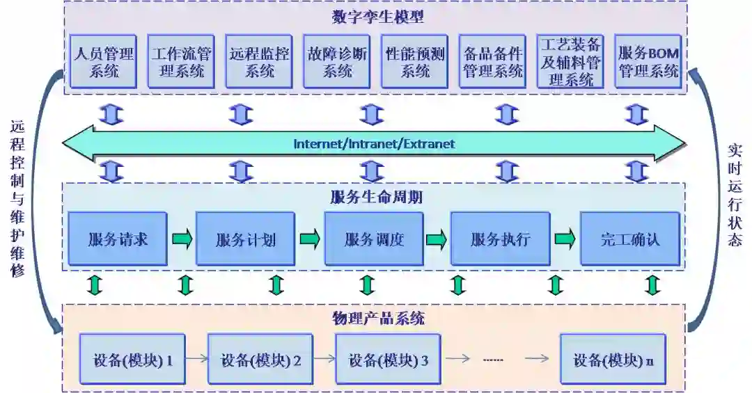 新型产品服务模式下,资源、工作流、产品实时监控、产品数据模型等存在多个系统中,如:PDM系统中存在产品设计数据EBOM和三维模型;CRM系统中存在客户数据与服务需求数据;ERP中存在制造阶段的MBOM信息、备品备件信息、质量信息等。跨业务、跨系统之间的虚实映射与无缝集成存在较大难题,研究它们之间的虚实转换机制与集成方法,实现服务对象层、业务层、数据层之间的数据有机转换、集成与优化管理。