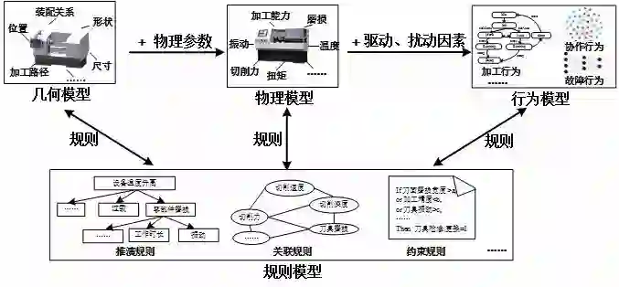 如图3所示,模型融合是为实现物理车间到虚拟车间的真实完整映射与反映,分别从几何、物理、行为、规则等多个维度对车间进行建模,并对所建立的模型进行评估和验证保证模型的正确性和有效性;在此基础上,通过将各维度模型进行关联、组合与集成,使其在信息空间级连与融合为一个完整的、具备高忠实度的虚拟车间模型。